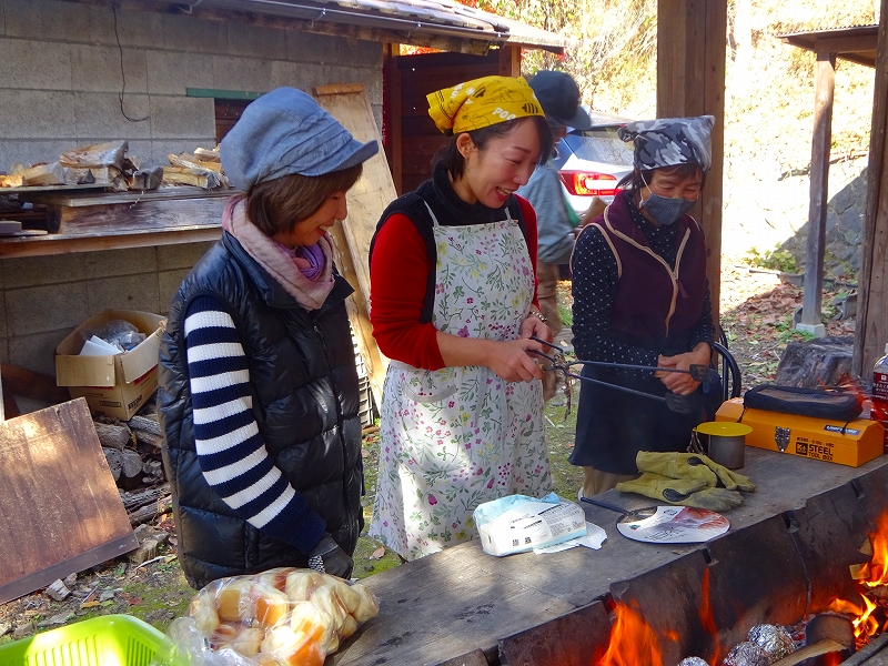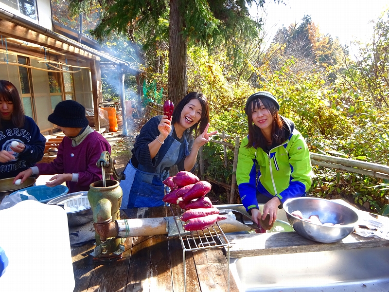 庭の囲炉裏テーブルで、煙と格闘しながらも一生懸命焼いてくれた焼き芋は